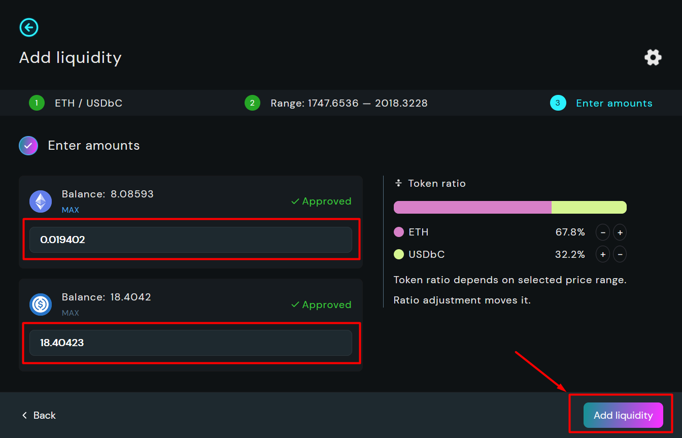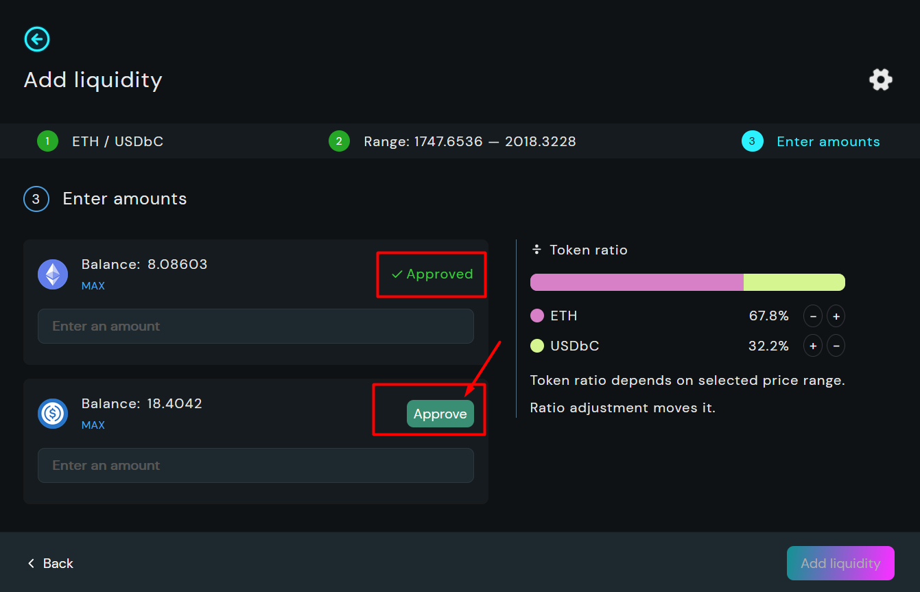 ## 7. Select amounts and Add Liquidity