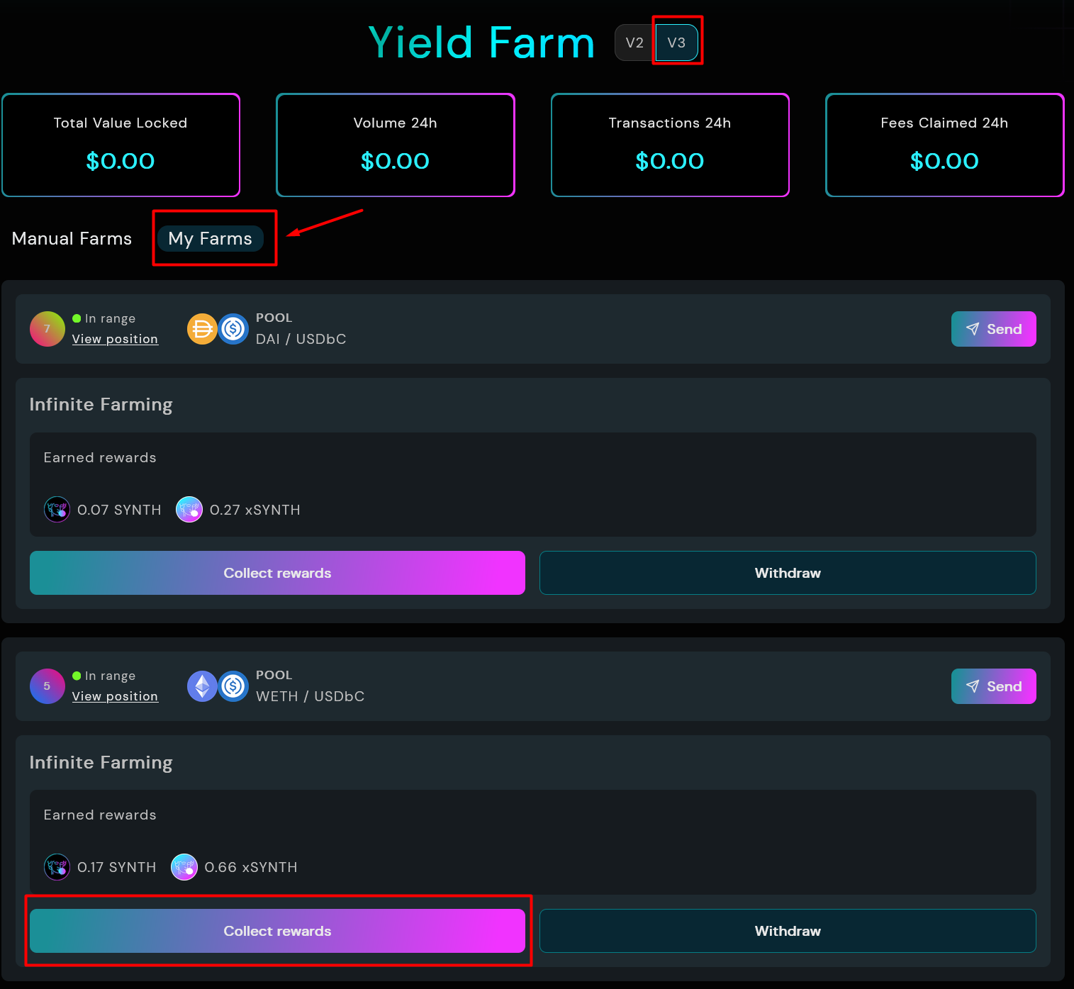 Navigate to Yield / V3 and select My Farms. Choose your CL position in Farm and click on Collect rewards.