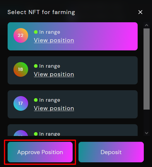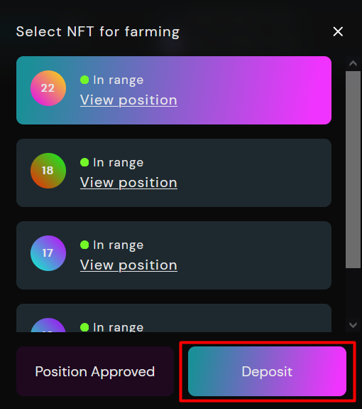Once your position is approved, you can Deposit (Stake) to Farm and start Farming.