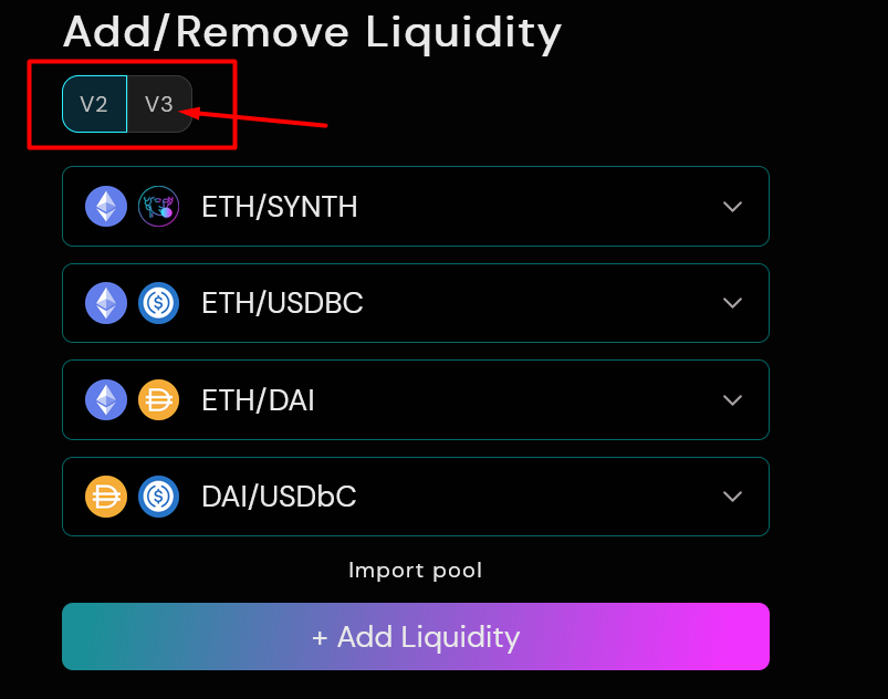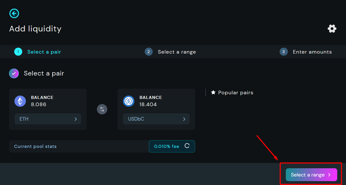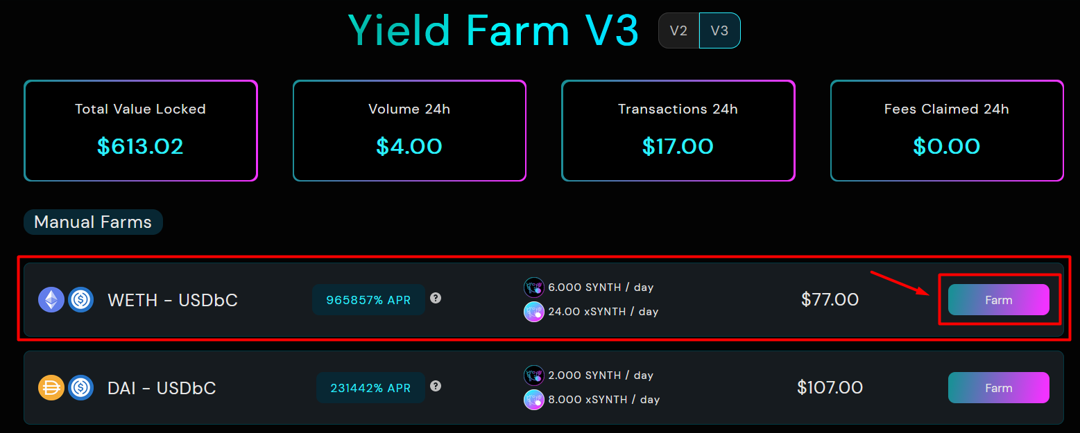 Click on appropriate farm, in our case we create CL position for WETH-USDbC.