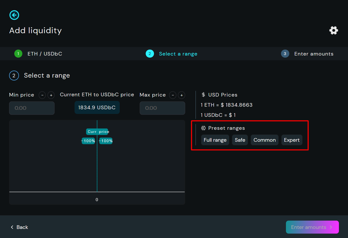 You can choose from 4 preset ranges (Full range, Safe, Common, Expert) or enter your desired values manually. Keep in mind that the narrower the range, the more fees you can earn, but it also comes with higher risk due to volatile price movements.&#x20;